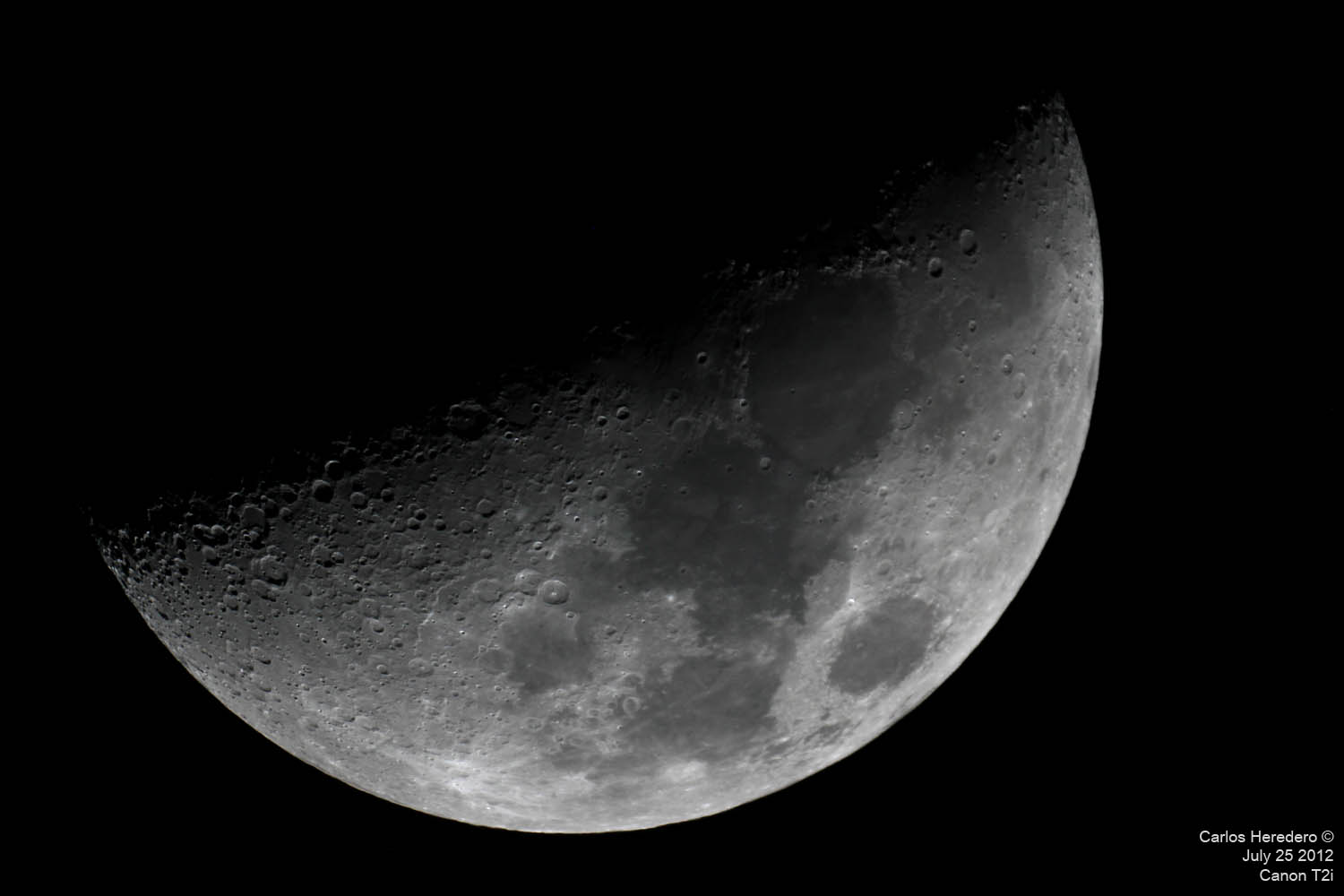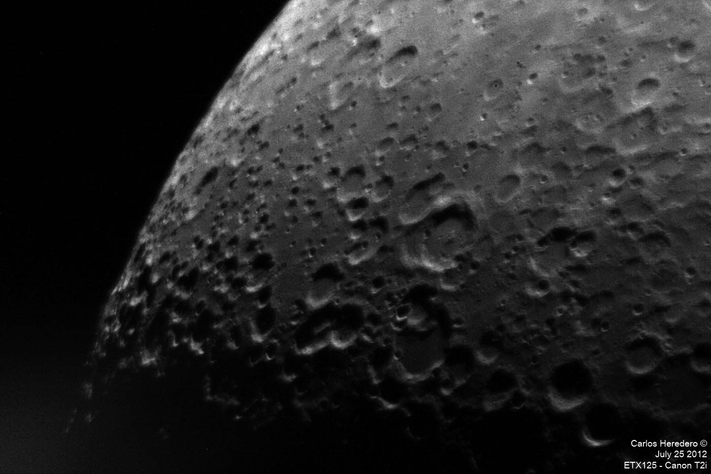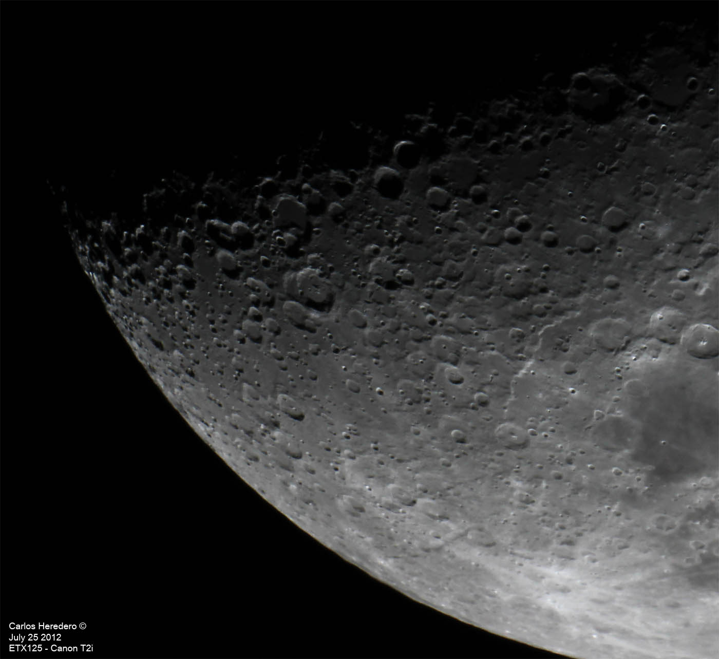 Luna creciente Fotos tomadas con la Canon T2i, y el telescopio ETX125, a foco primario. Excepto un par de fotos que fueron tomadas con un barlow, y cuyo resultado nunca es muy aceptable. Aquí con diferente longitud del adaptador. Detalle de los cráteres… Detalle de los mares… Alfonso, Arzachel y otros cráteres…. Mares… Limbo lunar… Zonas oscuras… Detalles de este trio…. Polo lunar…. Más cráteres…