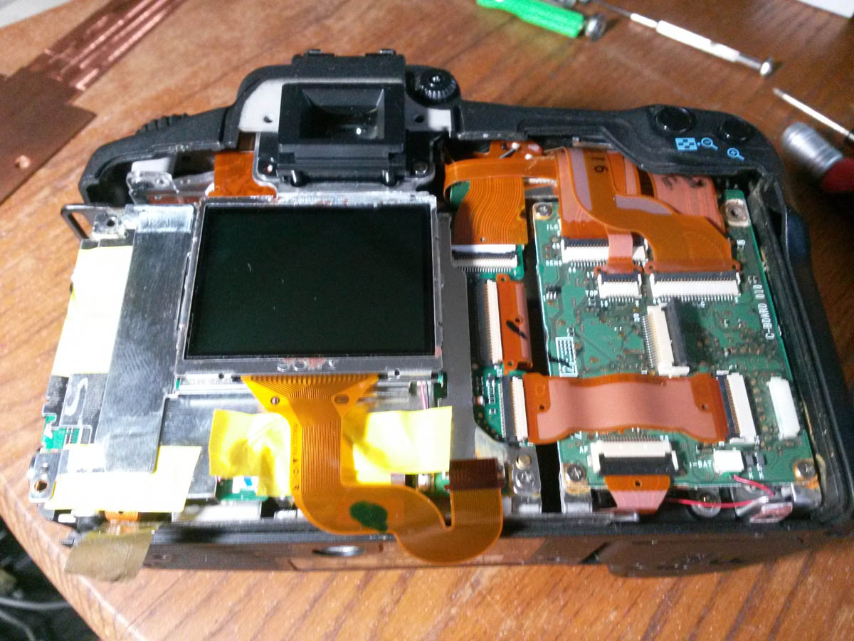 El proceso de abrir la camara no es demasiado complicado, y teniendo a mano los destornilladores y las herramientas necesarias, y unos depositos para colocar los tornillos en secuencia de desarme, no debemos tener problema alguno. Por supuesto, hay que tener cuidado con los conectores y las cintas que deberemos desconectar dentro de la camara, pues son plasticos y fragiles.