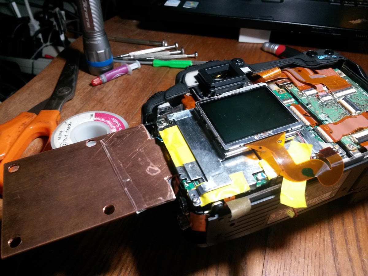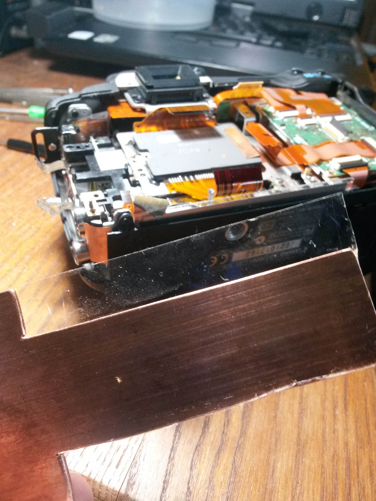 Luego de obtener de Internet documentos con los pasos para desarmar la camara, y de haberle hecho el cambio del filtro infrarrojo, tenia que hacer un segundo desarme de ella para colocarle la placa de cobre que transmitiria el calor desde el CCD hasta el exterior, donde colocaria los peltier y un disipador de valor, de alminio, y un fan.