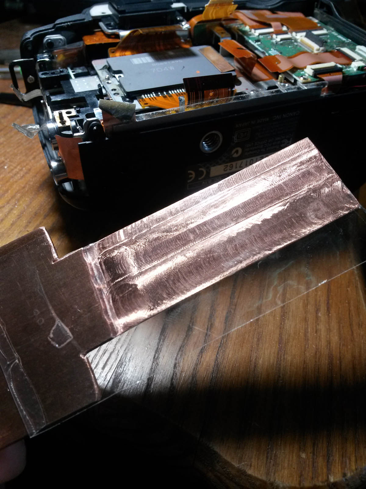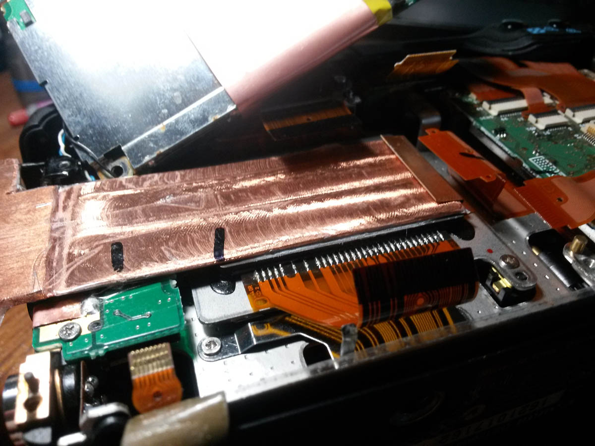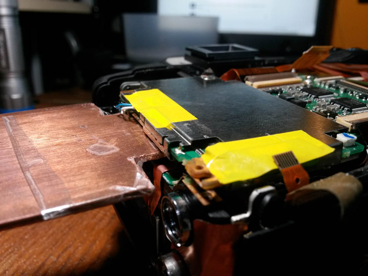 Imagen: la placa de cobre introducida bajo la presilla lateral derecha del CCD. Se aprecian las marcas negras para retirar cualquier suciedad o plastico restante en la zona de contacto con el CCD.