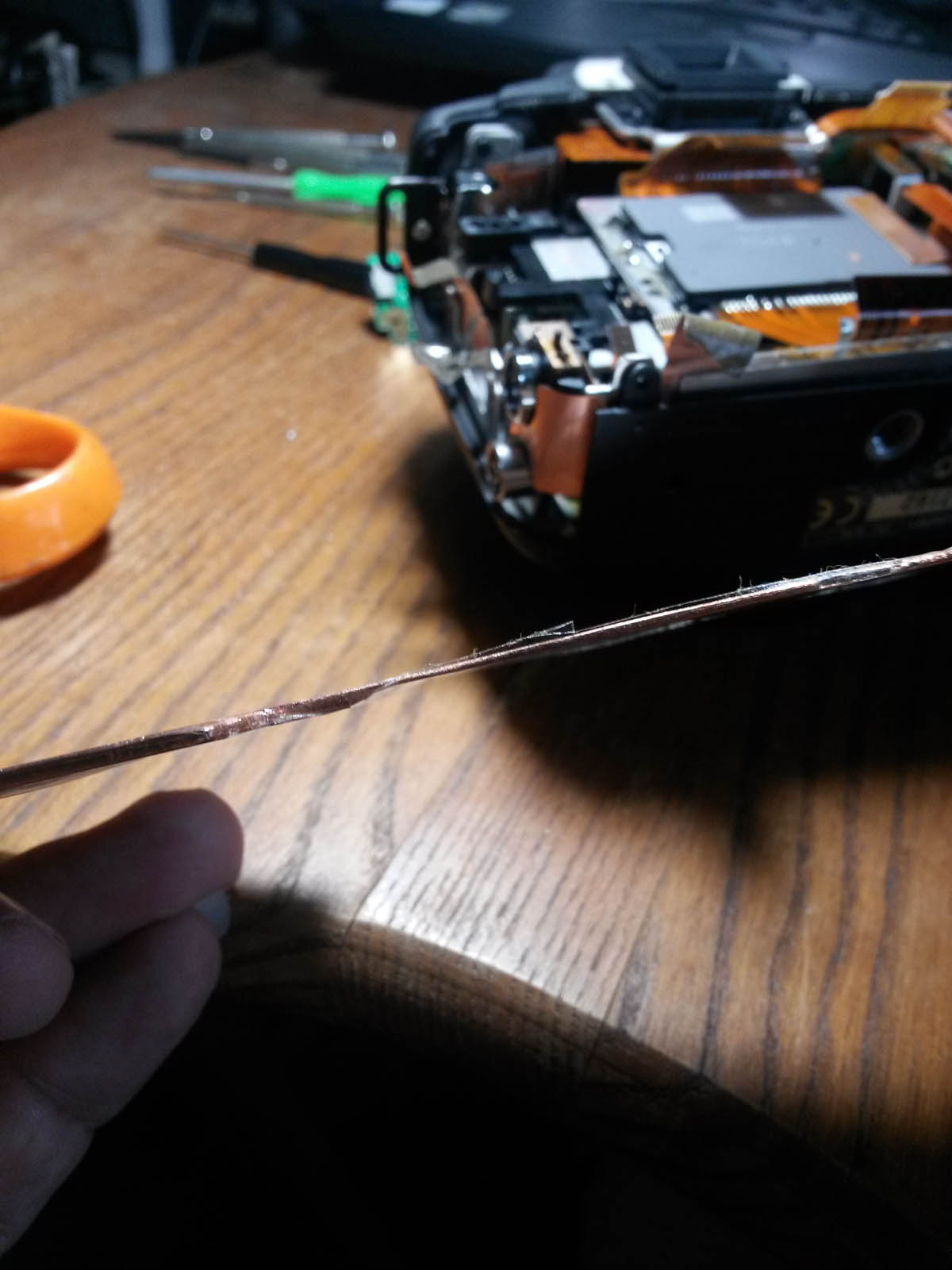 Una vez introducida la placa de cobre, la presilla que levantamos un poco debe quedar presionandola hacia el CCD. No debe quedar suelta. Antes de retirar nuevamente la placa de cobre, mediremos hasta que punto debemos estar seguros que en la cara que dara hacia el CCD, no quede plastico o suciedad alguna, podemos marcarlo usando un plumon o marker negro por la cara superior de la placa.