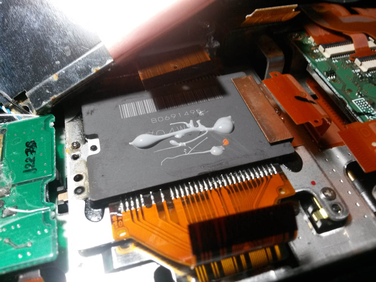 Hay que tener mucho cuidado de no embarrar los demas componentes de la camara con esta pasta, asi que el proceso debe hacerse con cuidado y mucha calma. Una vez lograda una distribución adecuada de la pasta, la colocaremos en su sitio, apoyandola sobre el CCD y moviendola en varios sentidos, para que la pasta se distribuya aun mas y se peguen ambas superficies lo mas cerca posible.
