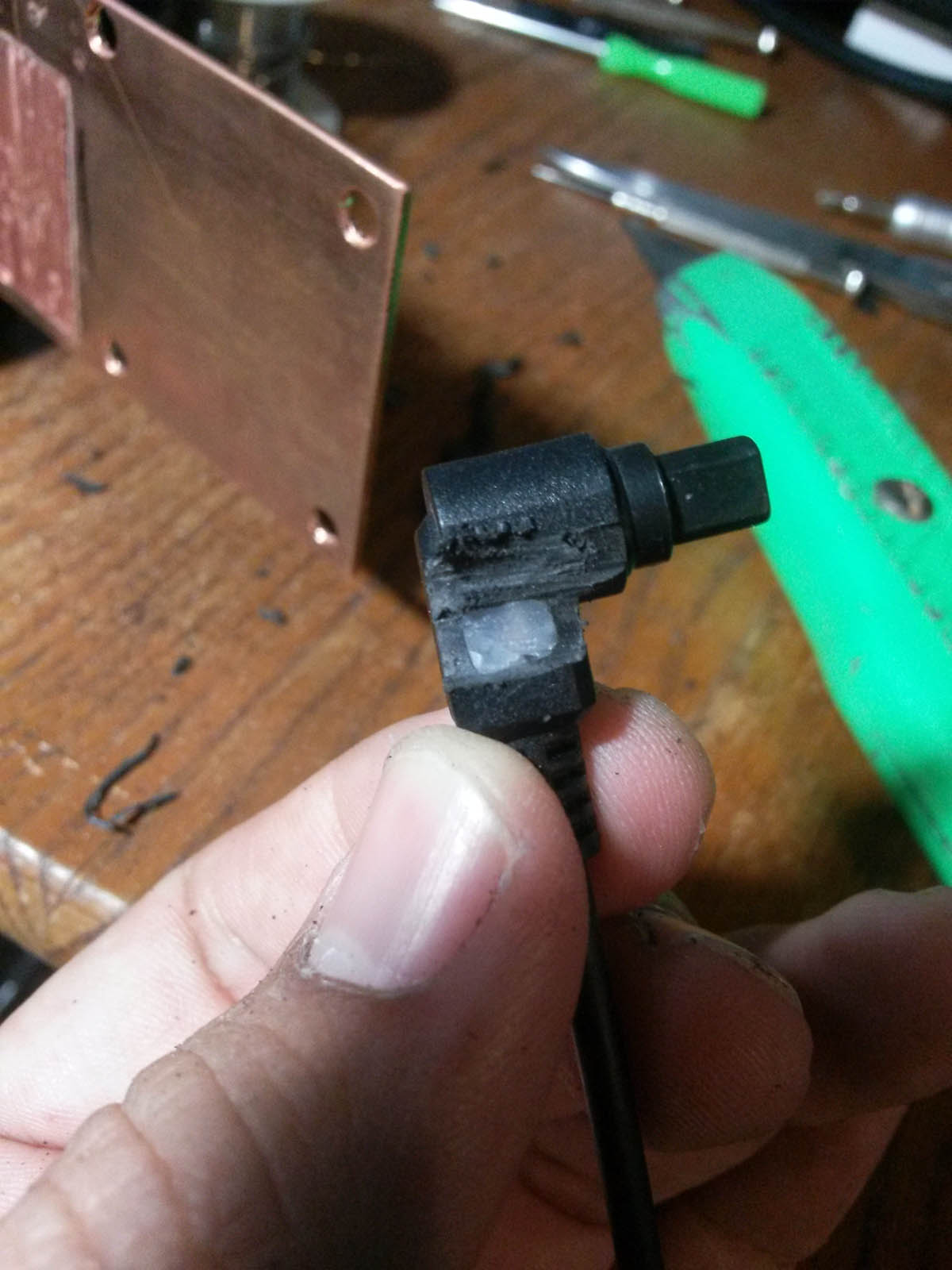 Imagen: conector USB rebajado por un costado para que pueda entrar en su posición.