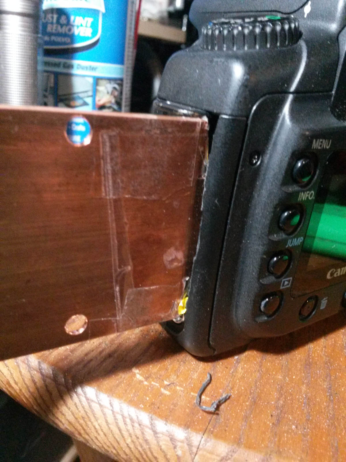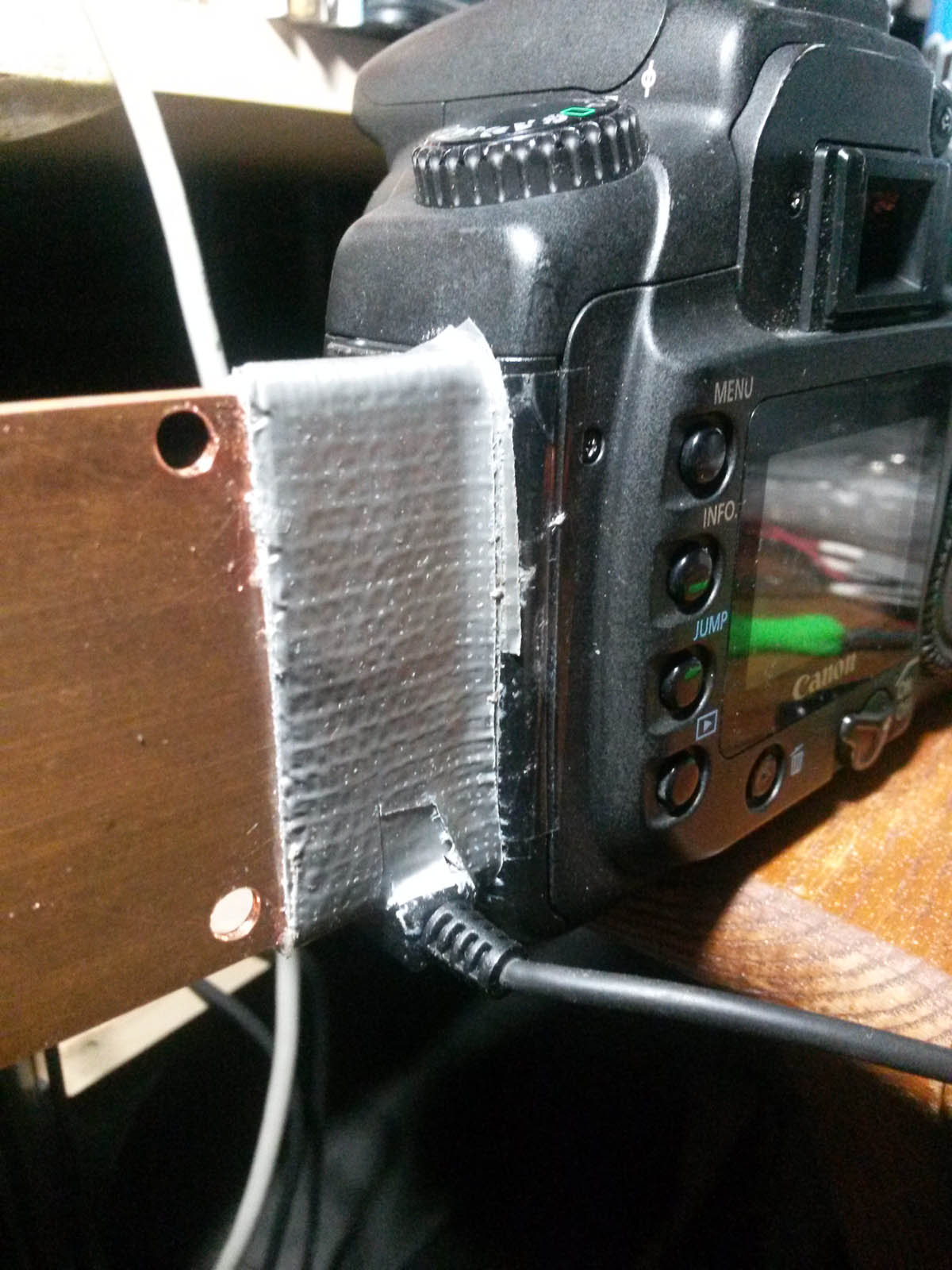 Otro punto importante a chequear es la pequena placa que existe a la izquierda, justo en el borde de la camara, la cual contiene el USB y el conector del control remoto, ambos muy importantes para controlar la camara con la computadora o un disparador programable. Si no estamos seguros colocaremos un pequeño pedazo del mismo masking tape sobre ella, para evitar que haga cortocircuito con la placa de cobre, que saldra justo por ese costado.