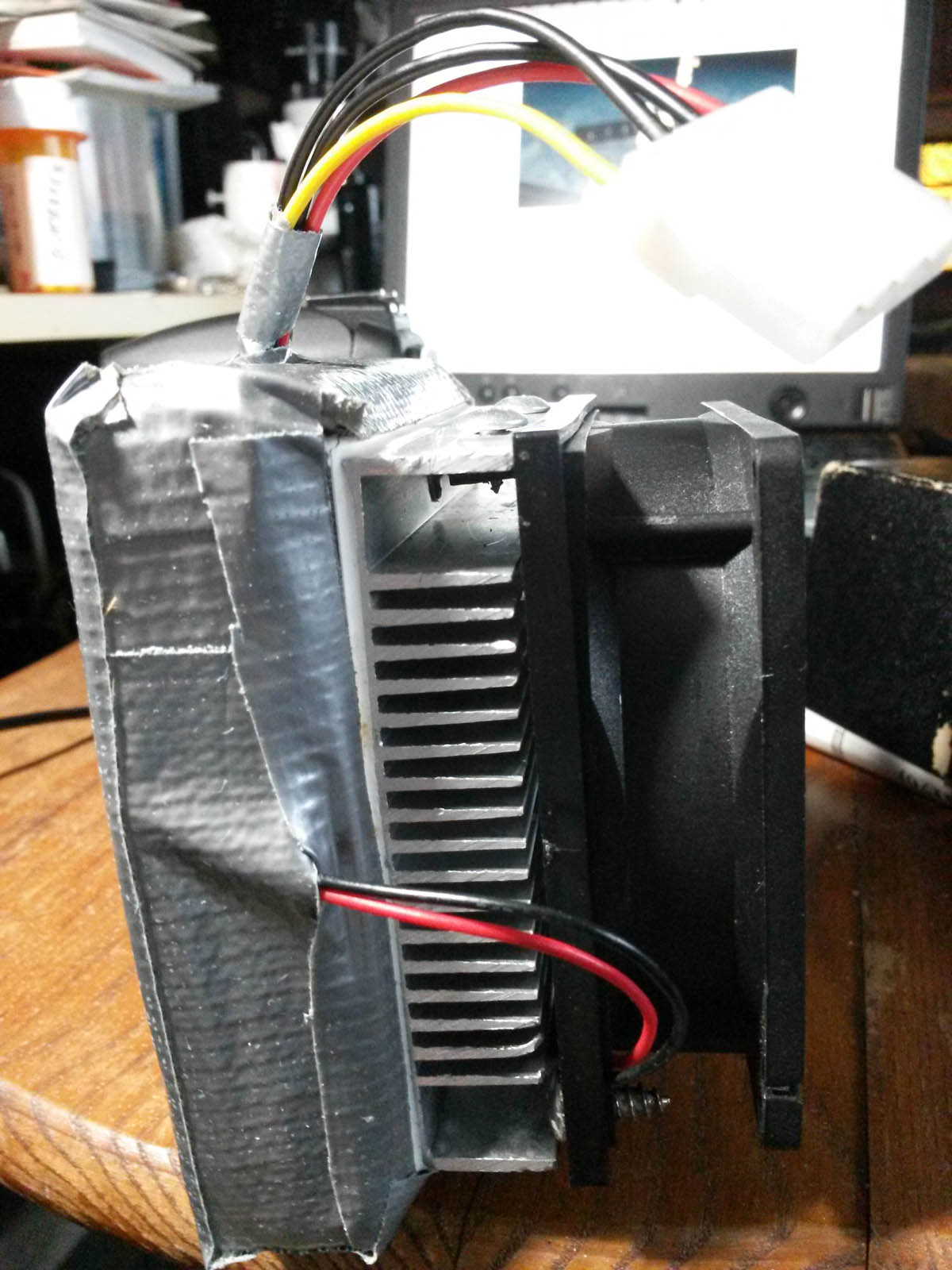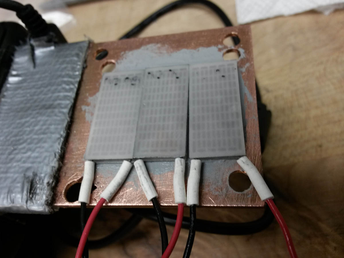 En mi caso, esperaba usar la fuente y el peltier que obtuve de esta forma, pero ambos estaban malos. Un amigo me entrego tres pequenos peltier, y tuve que adquirir una fuente tipo adaptador de laptop, para alimentarlos.