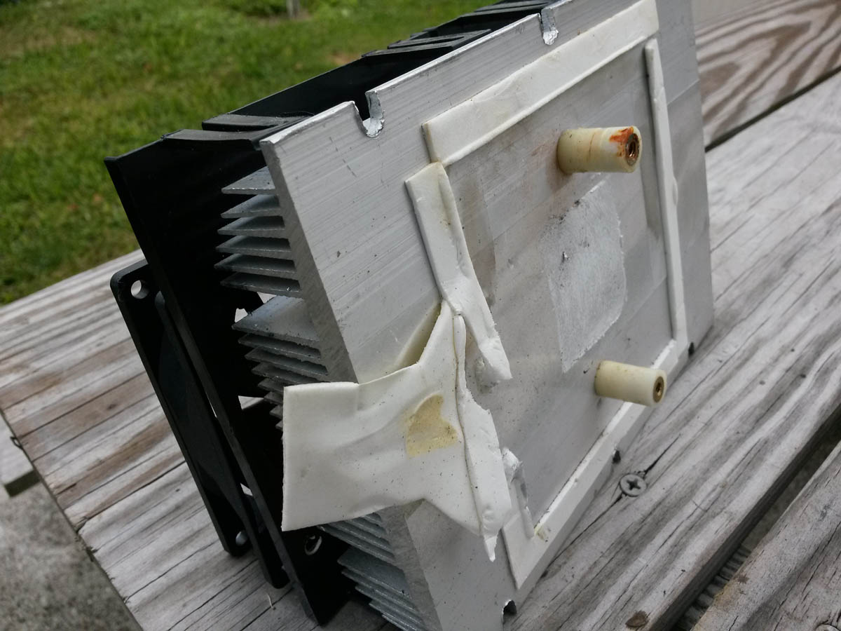 Yo decidi colocar la parte caliente del lado opuesto a la camara, para evitar calentarla con el flujo de aire caliente que sale del disipador. Pegamos los peltier a la superficie del cobre con la pasta, e inmediatamente ponemos el disipador, previamente preparado con pasta conductora, y fijamos el conjunto con los tornillos plasticos. Debemos colocar una capa aislante entre ambos metales, yo use una forma de poliespuma, con un agujero central con la misma forma y tamaño del conjunto de peltiers, esto es muy importante para evitar que el calor del lado del disipador se filtre hacia la placa de cobre, reduciendo la eficiencia del conjunto.